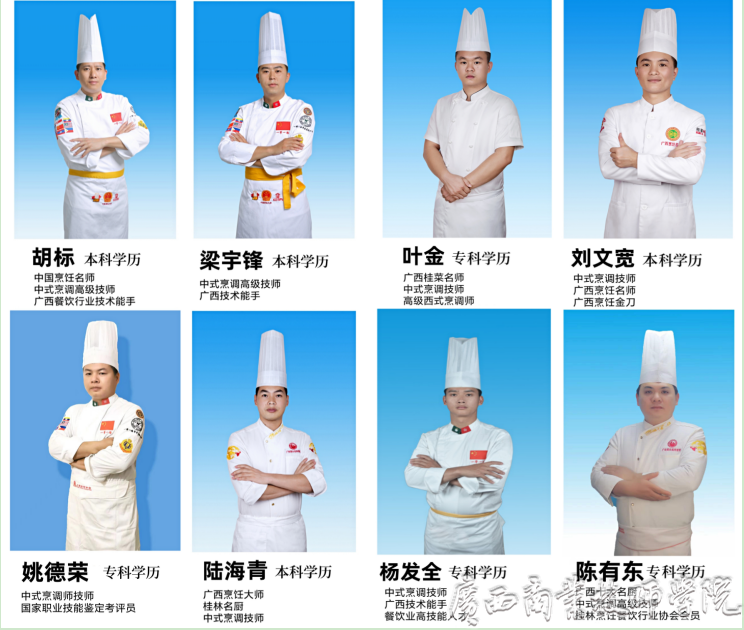 烹饪与营养学部拥有中国烹饪大师16人,国家级大师工作室2间,自治区级大师工作室4间,市级技能大师工作室1间,市级专项专家工作室2间,全国模范教师1名,全国教学名师1名,广西技术能手12名,教学水平高、技能水平强、结构合理的优秀师资队伍。既有学术型的文化课教师,也有技术型的专业能手,更有促进学生综合素养提升的专业辅导教师。